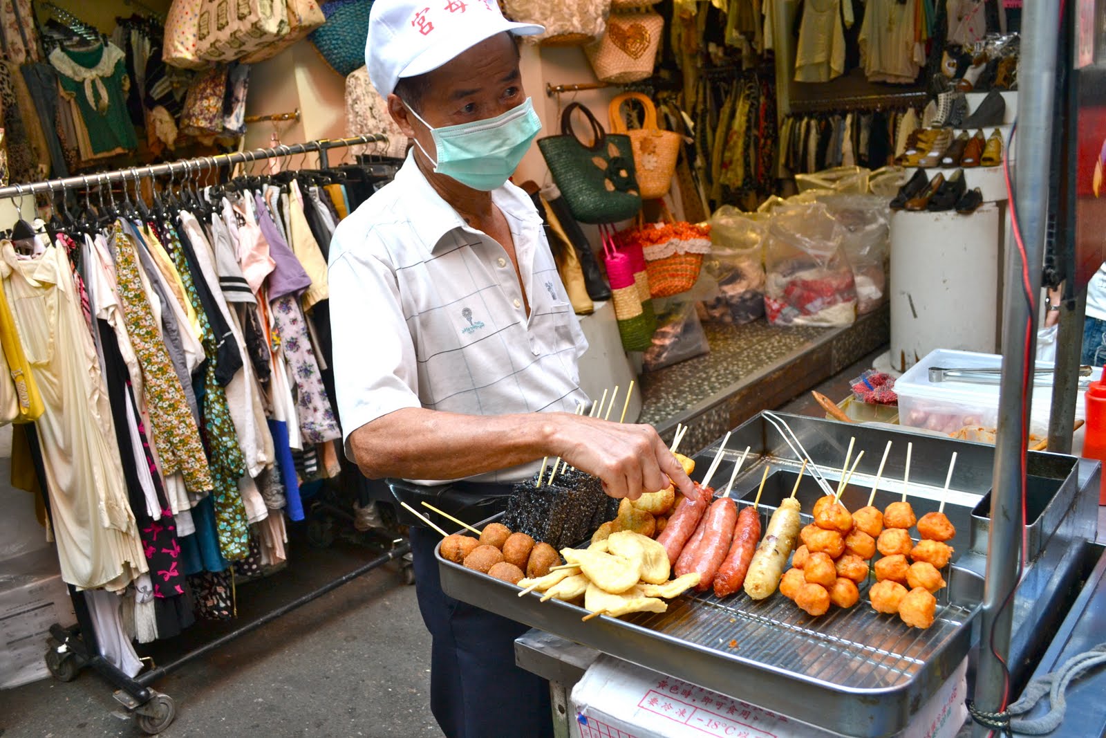 Street vendors: from left to right--pig blood cake, chicken nuggets, chinese sausage, & squid balls (don't know the bottom two). We only tried the squid balls, but ended up going back for seconds. not a fan of blood, nuggets, or sausage...